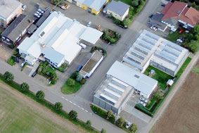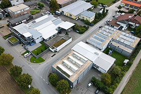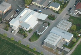 Eine Aufnahme von 2006 zeigt die Anbauten am ur- sprünglichen Firmengebäude sowie die 1999 neu gebaute und 2006 erweiterte Fertigungshalle.